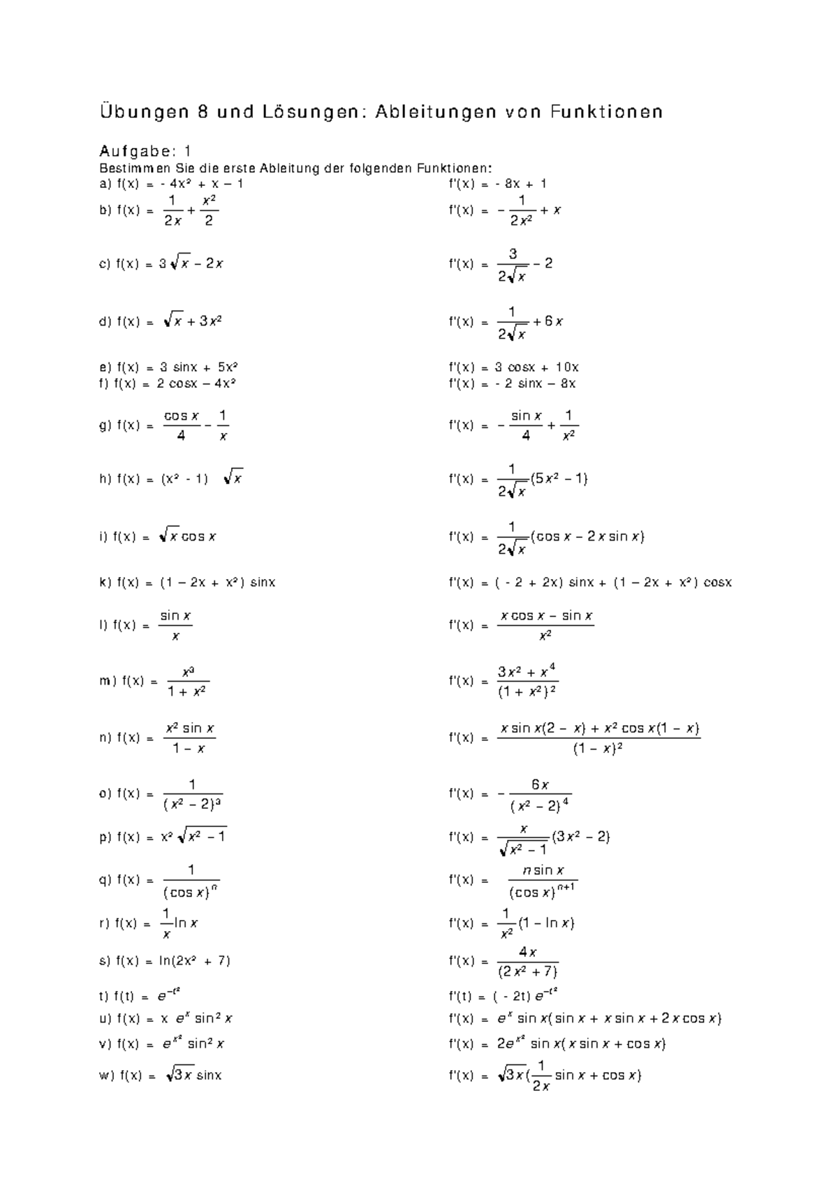 Ue8ue8lableitungen Übungen 8 und Lösungen Ableitungen von Funktionen Aufgabe 1 Bestimmen
