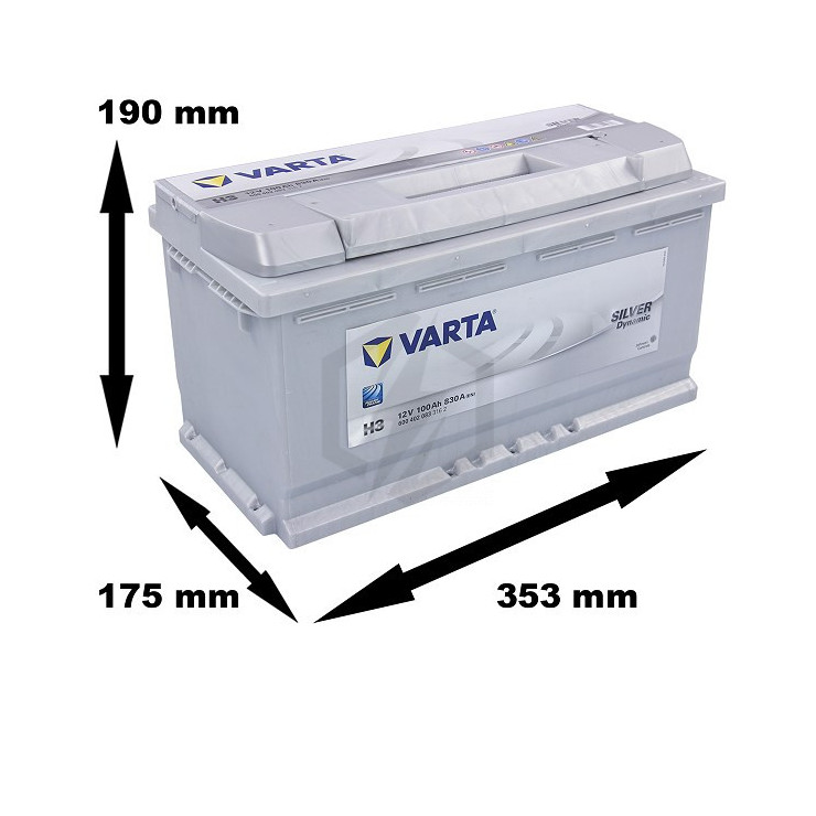 Battery Varta H3 100Ah 830A 12V. For extra power and premium performance, VARTA® Silver Dynamic offers extraordinary starting power that will meet the most demanding power demands, as it provides superior performance for cars with high-end equipment. VARTA® Silver Dynamic is the premium quality battery for vehicles without Start-Stop function.