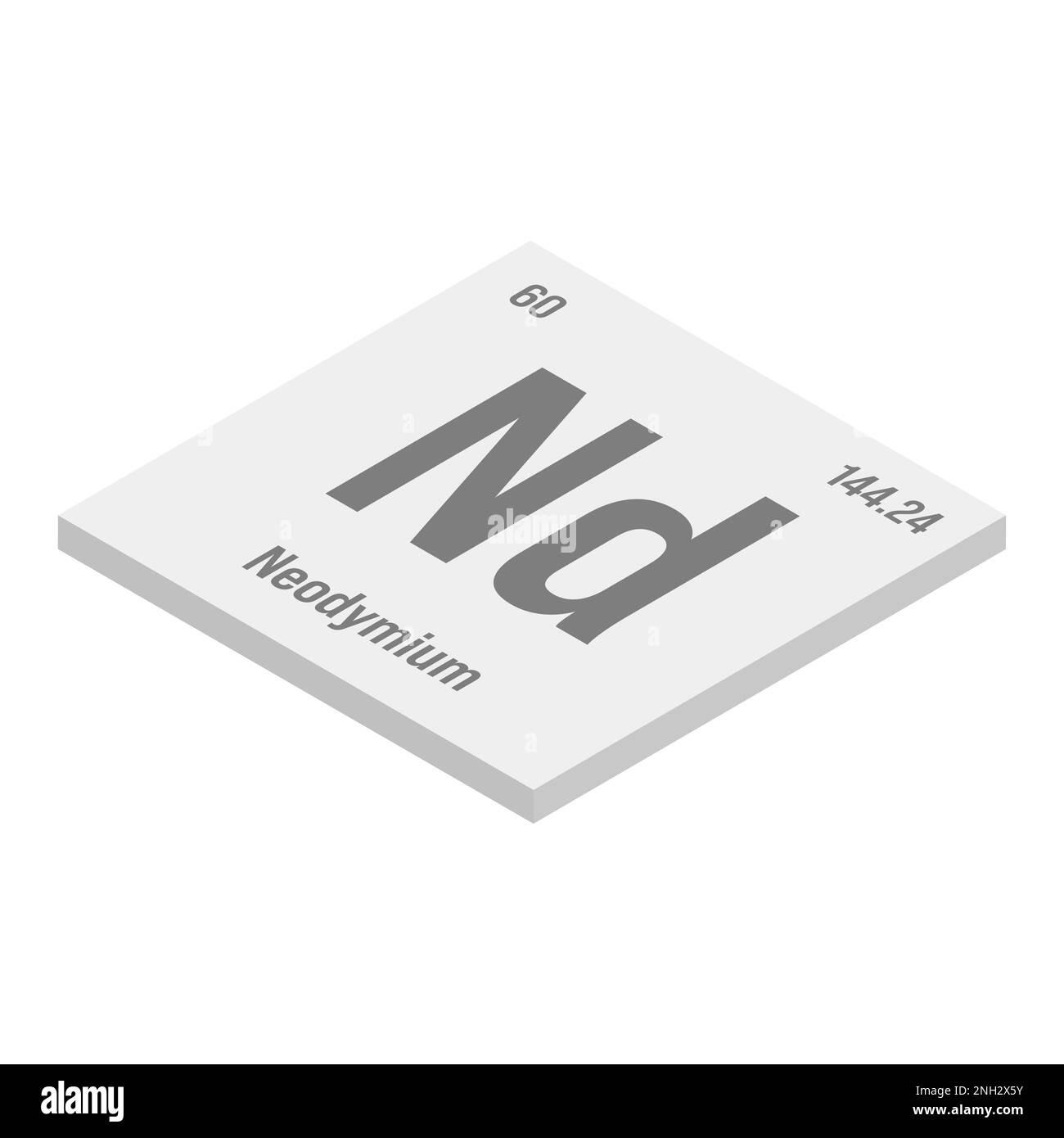 Isometrische Neodym, ND, graue 3DDarstellung des Periodenelements mit Name, Symbol, Atomzahl