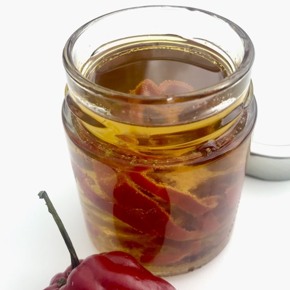 Auf 500 ml Öl empfehle ich zwischen 6 und 8 getrockneten Chilischoten. Das kommt aber sehr darauf an, welche Chilis zu verwendest und wie scharf Du Dein Chiliöl haben möchtest. Ich verwende gern mildere getrocknete Chilis wie Guajillo, Anch,, Chipotle oder frische scharfe Chilis wie Jalapeños, Habanero oder Serrano.