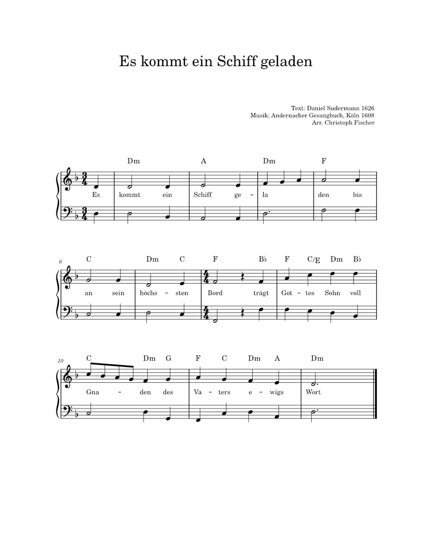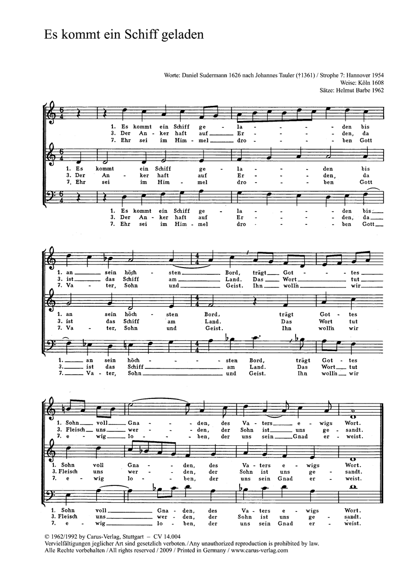Es kommt ein Schiff, geladen bis an sein' höchsten Bord, trägt Gottes Sohn voll Gnaden, des Vaters ewigs Wort. Das Schiff geht still im Triebe, es trägt ein teure Last; das Segel ist die Liebe, der Heilig Geist der Mast. Der Anker haft' auf Erden, da ist das Schiff am Land. Das Wort will Fleisch uns werden, der Sohn ist uns gesandt. Zu.