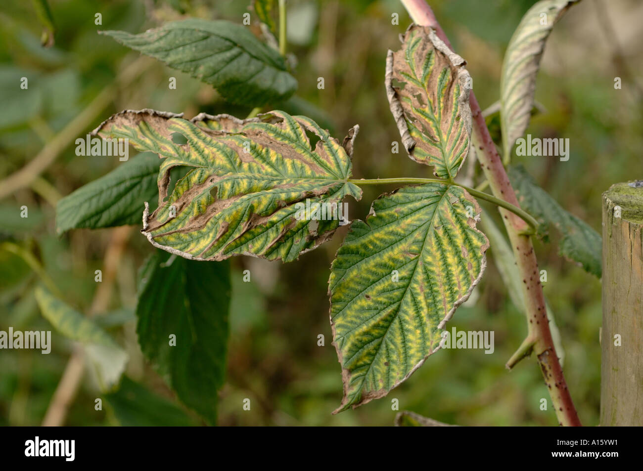 Kontamination Schaden an Himbeerblättern, verursacht durch Glyphosat Unkrautvernichter Kontakt