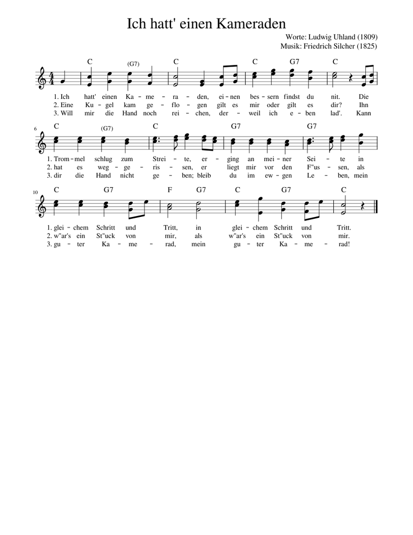 Melodie: Friedrich Silcher (1789-1860) - Text: Ludwig Uhland (1787-1862). 1.Ich hatt einen Kameraden, einen bessern findst du nit. Die Trommel schlug zum Streite, er ging an meiner Seite in gleichem Schritt und Tritt. 2. Eine Kugel kam geflogen: Gilt sie mir oder gilt sie dir? Ihn hat es weggerissen, er liegt mir vor den Füßen