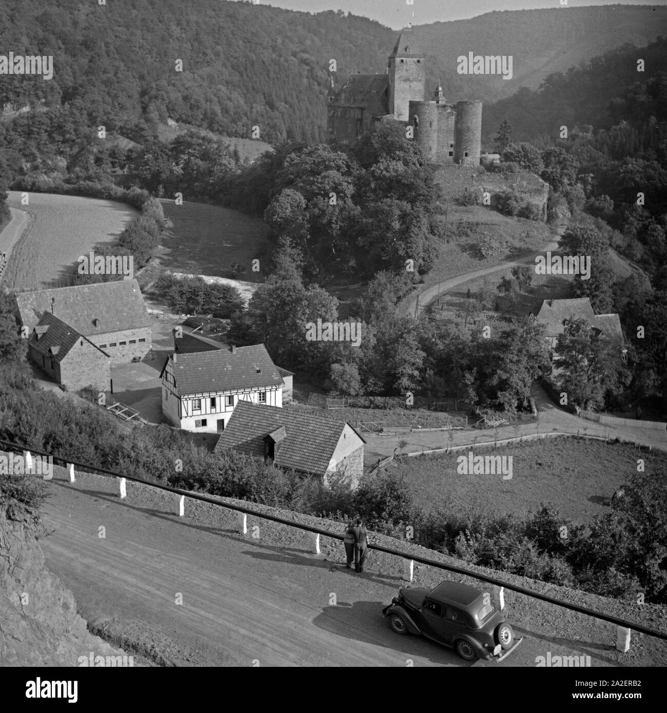 Mit dem Ford Eifel bei Schloss Bürresheim in der Eifel, Deutschland 1930er Jahre. En Buerresheim