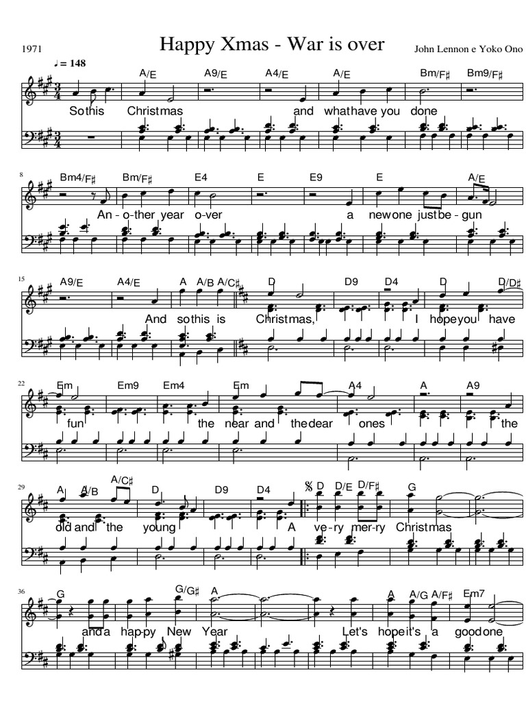 Verso 1: A A9 A4 So this is christmas A Bm B9 B4 And what have you done Bm E4 E E9 Another year over E A A9 A4 And a new one just begun A D D9 D4 And so this is Christmas D Em Em7+ Em9 I hope you have fun Em A4 A A9 The near and the dear one A D D9 D4 The old and the young D G A very merry Christmas A And a happy New Year Em G Let's hope it's a good one D E Without any fear Verso 2: A A9 A4.