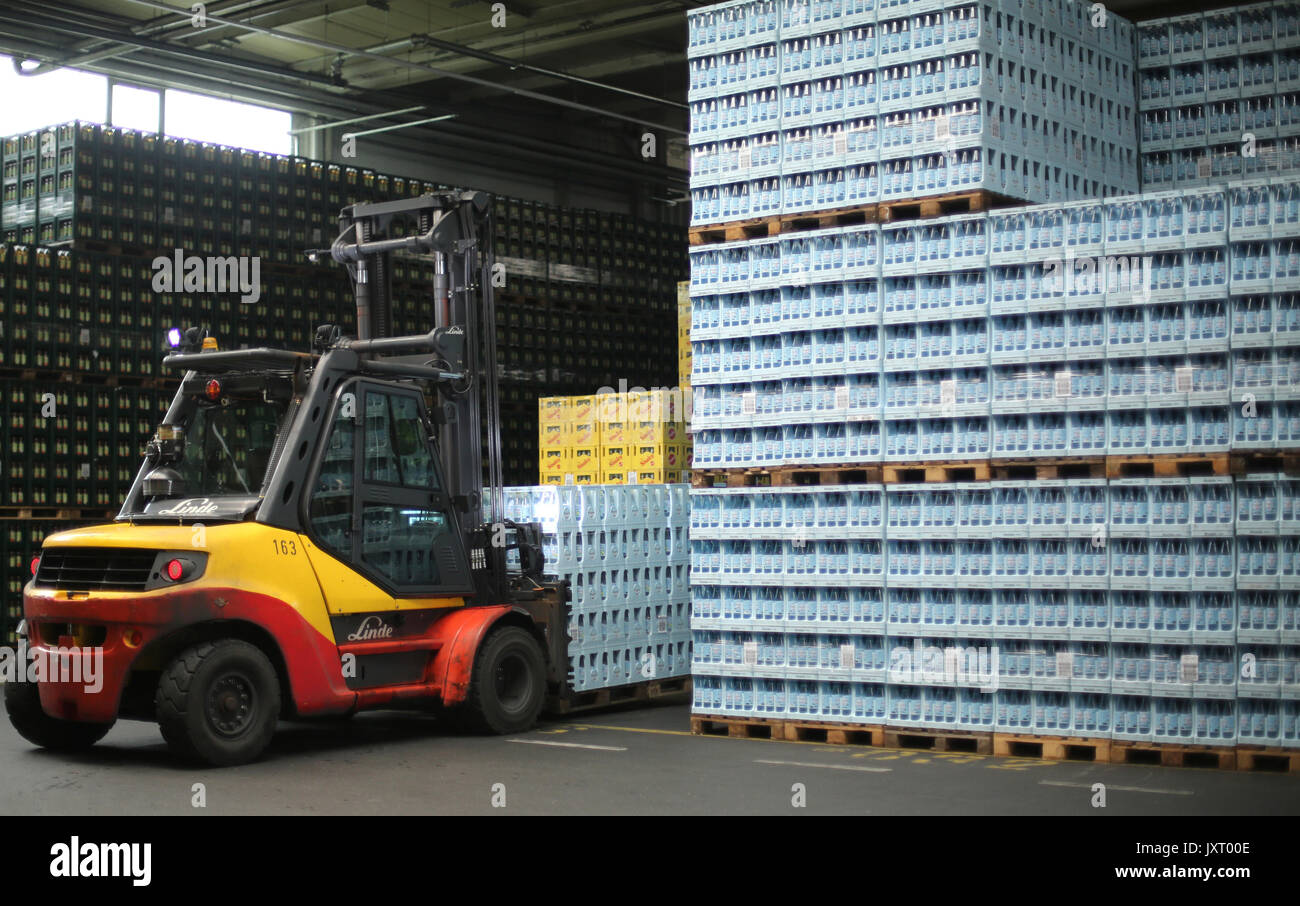 Duisburg, Germany. 15th Aug, 2017. A forklift transports crates of PET returnable bottles filled