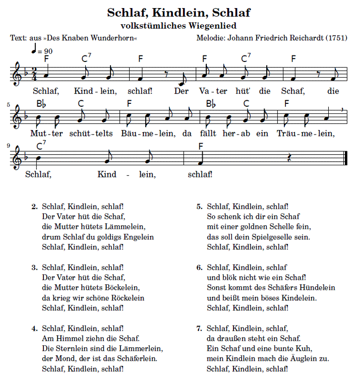 Schlaf, Kindlein, schlaf gilt als das bekannteste deutschsprachige Schlaflied, das jeder schon einmal gehört hat - und sei es auch nur mit dem Scherztext:. Schlaf, Kindlein, Schlaf! Dein Vater ist ein Schaf! Deine Mutter ist ein Trampeltier, was kann das arme Kind dafür? Auf die gleiche Melodie, die Johann Friedrich Reichardt (1752-1814) im Jahr 1781 komponierte, wird auch das nicht minder.