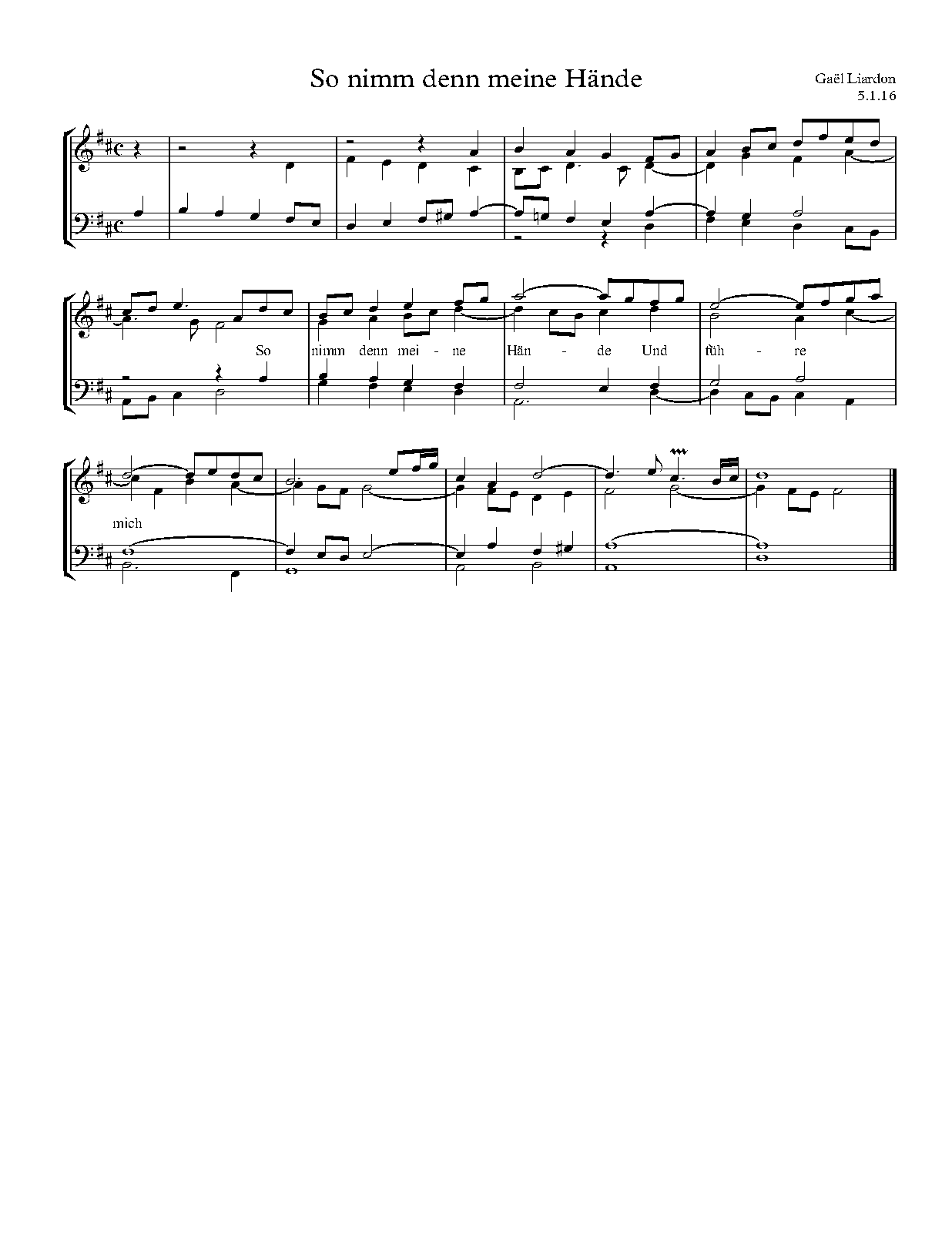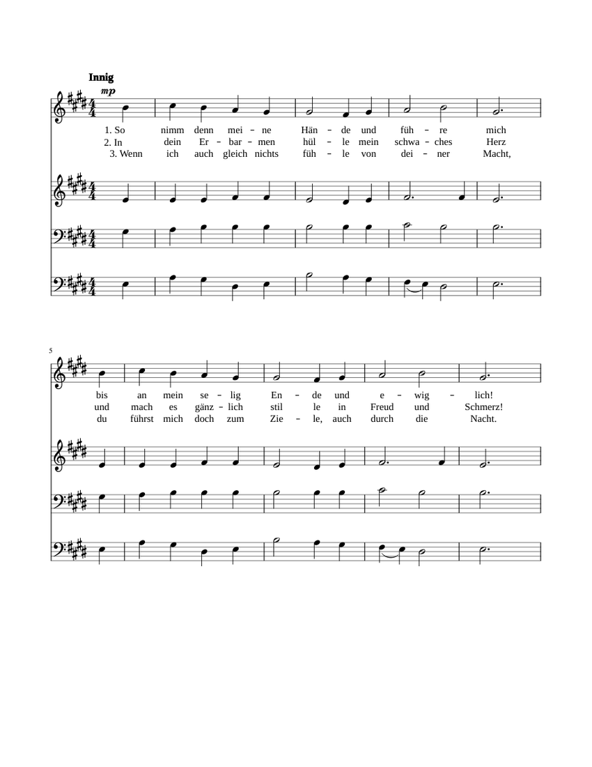 Text: So nimm denn meine Hände. 1. So nimm denn meine Hände / und führe mich / bis an mein selig Ende / und ewiglich. / Ich mag allein nicht gehen, / nicht einen Schritt: / wo du wirst gehn und stehen, / da nimm mich mit. 2. In dein Erbarmen hülle / mein schwaches Herz / und mach es gänzlich stille / in Freud und Schmerz.
